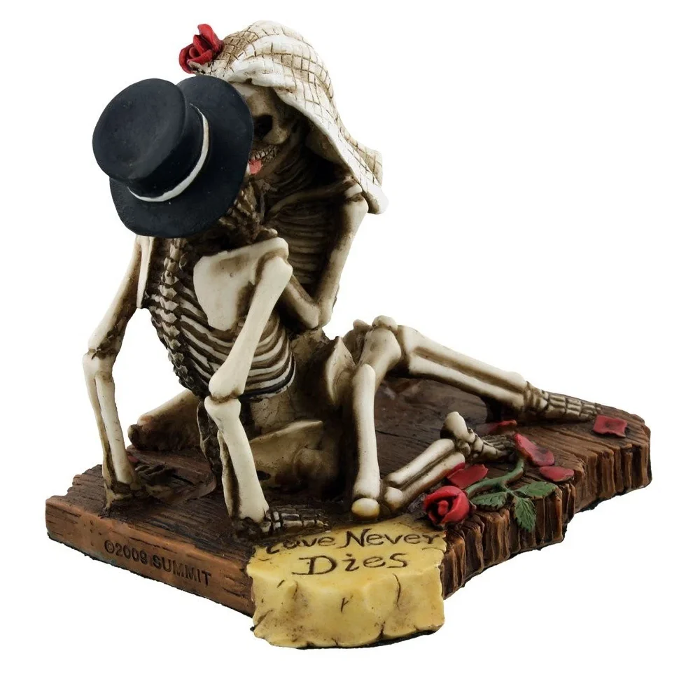 - A skeletal bride and groom sit above the words âLove Never Diesâ in this hand painted statuette.