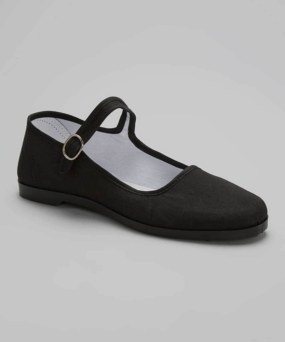 - These Maryjanes feature a plain black cotton upper and rubber outsole.