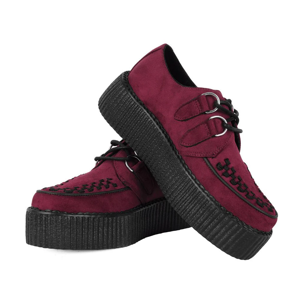 - These TUK Burgundy Faux Suede Mondo Creeper V3291 have a black woven interlace, and silver metal D-rings on our patented T.U.K. Skull n' Bones creeper sole design.
